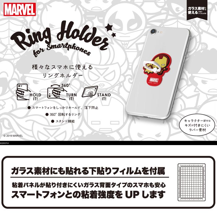 MARVEL アクリルダイカットリングホルダー【マーベル ロゴ スパイダーマン キャプテンアメリカ アイアンマン デッドプール 落下防止 ホールドリング スマートフォン リング ホルダー バンカーリング 360度 360° 回転 スマホスタンド ガラス背面でもしっかり貼れる】